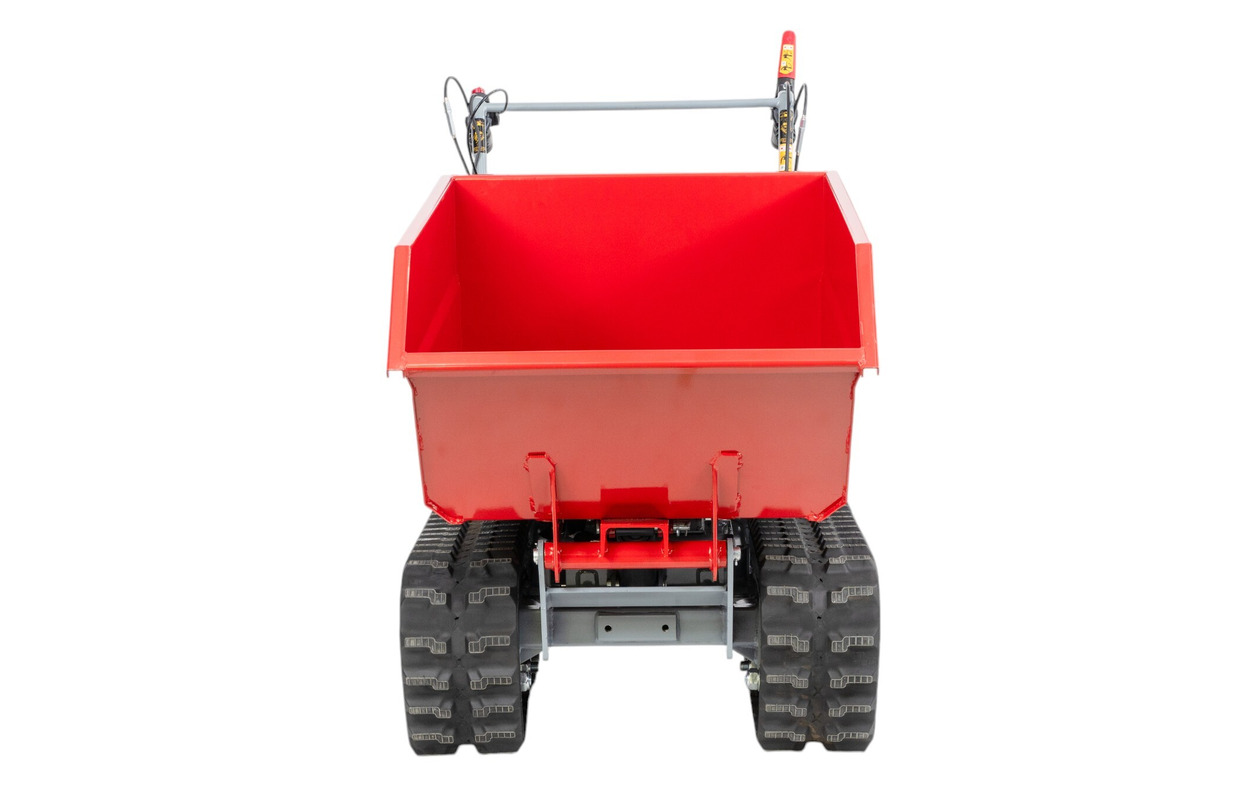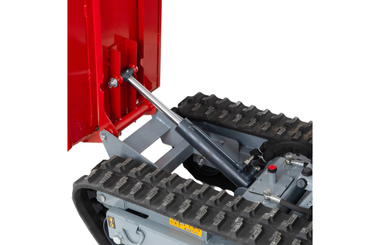 Dumper à chenilles à essence avec benne basculante hydraulique de 600 kg et fonction de montée d'escaliers, pour une utilisation sur des surfaces exigeantes avec de grandes différences de niveau.