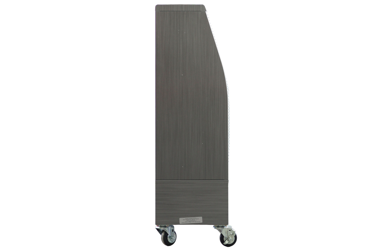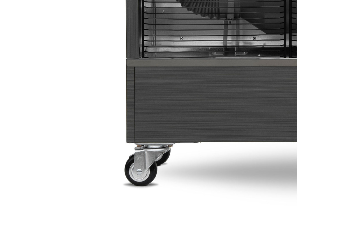 Boîtier résistant aux chocs et construction robuste en tôle épaisse, finition avec motif en acier inoxydable brossé - 4 roulettes caoutchoutées à fonctionnement régulier. Convient pour les déplacements fréquents sur des sols irréguliers. 4 grandes roulettes pivotantes de 75 mm avec frein. Les roulettes ne se bloquent pas sur les sols irréguliers et les grilles