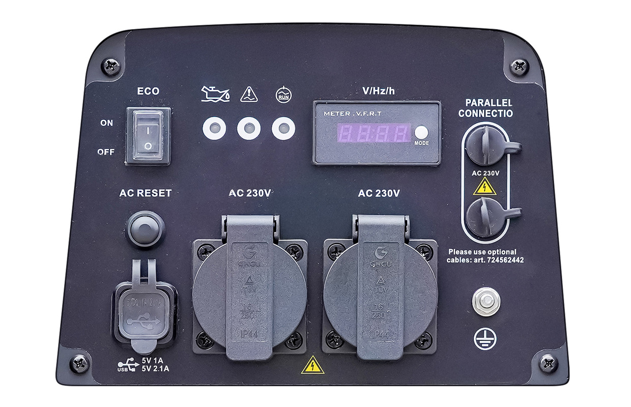 - Contact parallèle, le générateur peut être couplé à un autre générateur pour obtenir une puissance combinée plus élevée. Convient pour la prise parallèle optionnelle (art. PB3210)
