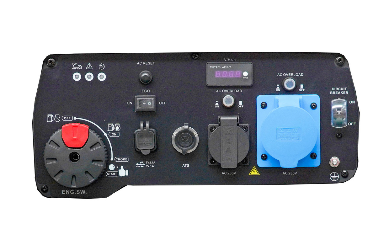- Affichage numérique avec affichage des paramètres : Tension (V), Fréquence (Hz), compteur d'heures (total) et compteur d'heures depuis la mise en service.