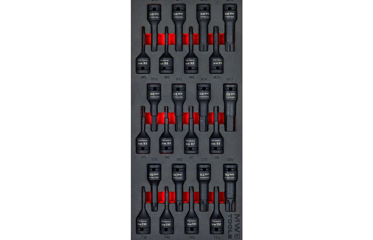Jeu d'embouts douilles à chocs 1/2" TORX-HEX-SPLINE 24 pièces module en mousse pour servante d'atelier MW Tools