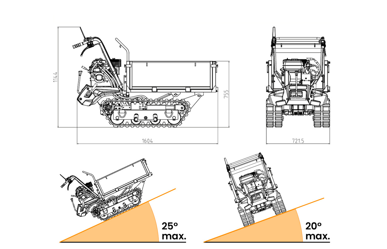 Grâce à ses 6 vitesses en marche avant + 2 vitesses en marche arrière, son moteur lourd et ses hautes chenilles, ce dumper convient pour tous les terrains et situations.