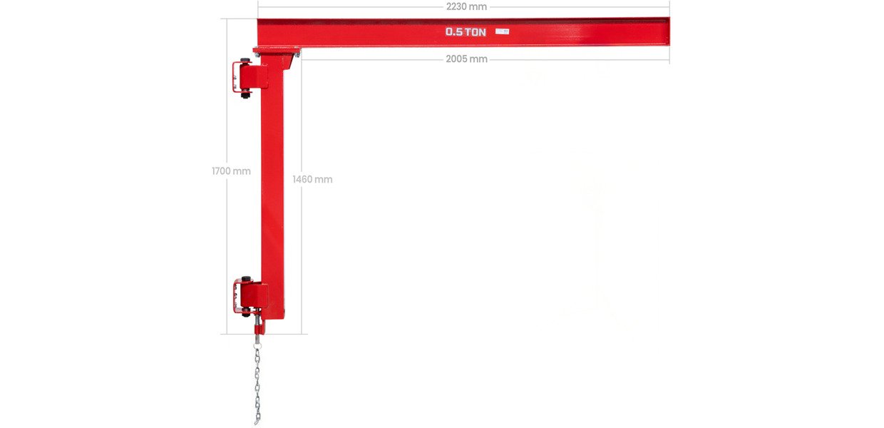 Grue pivotante 500 kg en version murale avec une longueur de 2000 mm et un angle de pivotement de 170°.