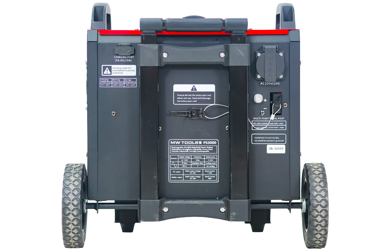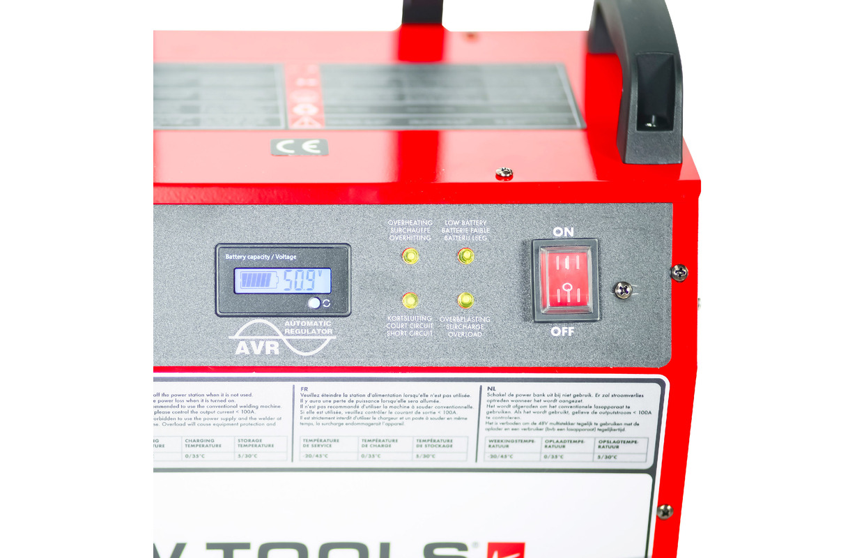 - La prise 48 V est multifonctionnelle, elle convient pour un chargeur solaire avec des panneaux solaires externes (non inclus) et pour connecter un éclairage LED ou un poste de soudage 48 V (non inclus), ainsi que pour toutes les applications à des tensions inférieures, telles que 12 V ou 24 V avec des convertisseurs appropriés (non inclus)