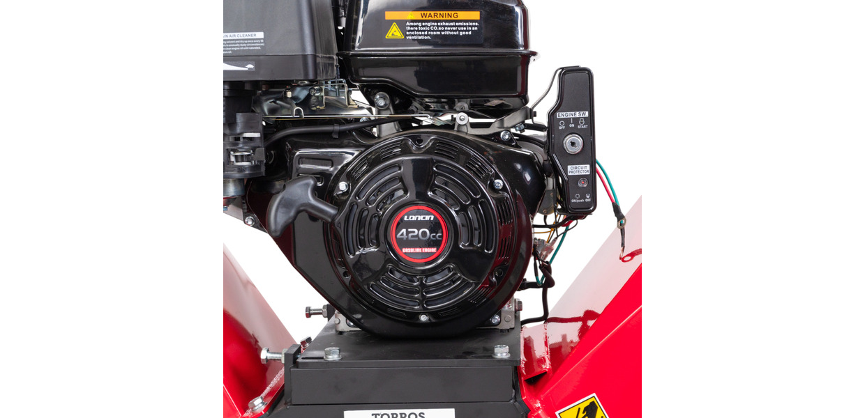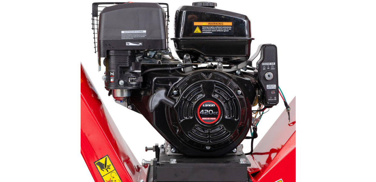 - Le broyeur est équipé d'un moteur à essence Loncin de 15 CV à soupapes en tête avec démarrage électrique, batterie de démarrage et clé