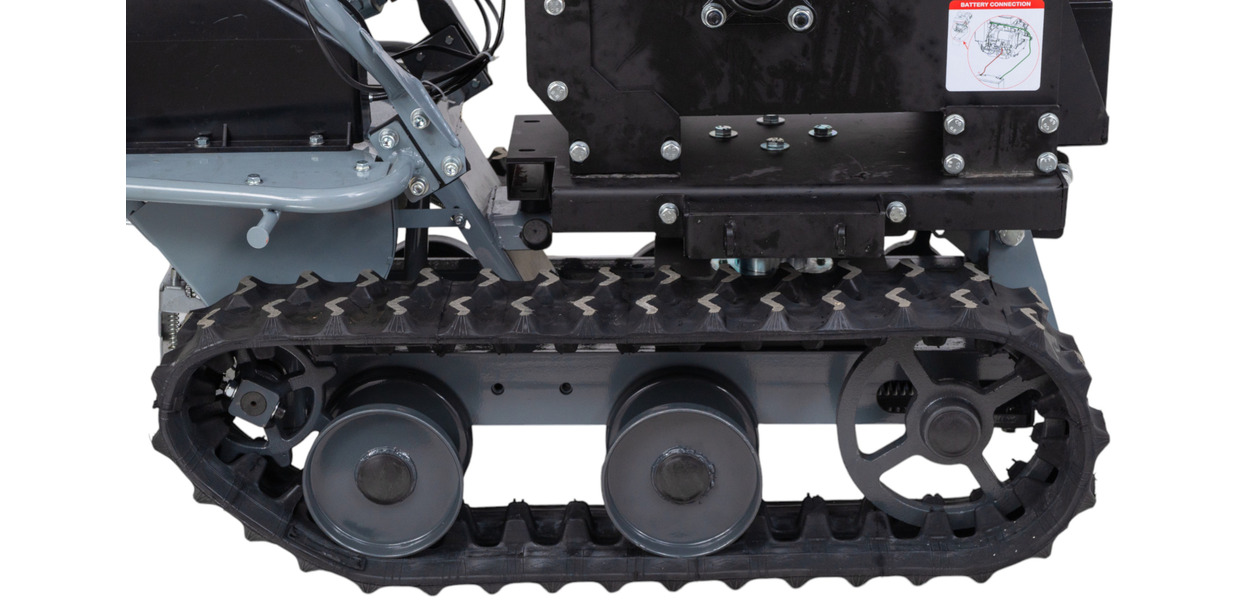 - La longueur des chenilles (700 mm) et leur largeur (180 mm) donnent une empreinte stable et large sur le sol et conviennent donc également au transport sur des surfaces marécageuses et irrégulières, sur des sols forestiers, etc.