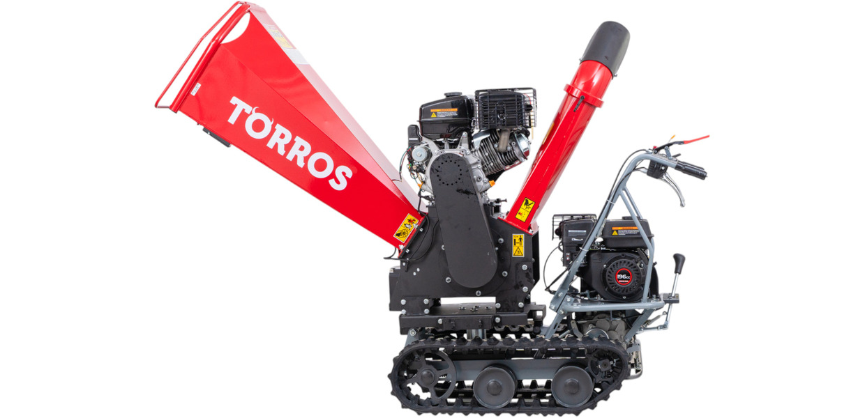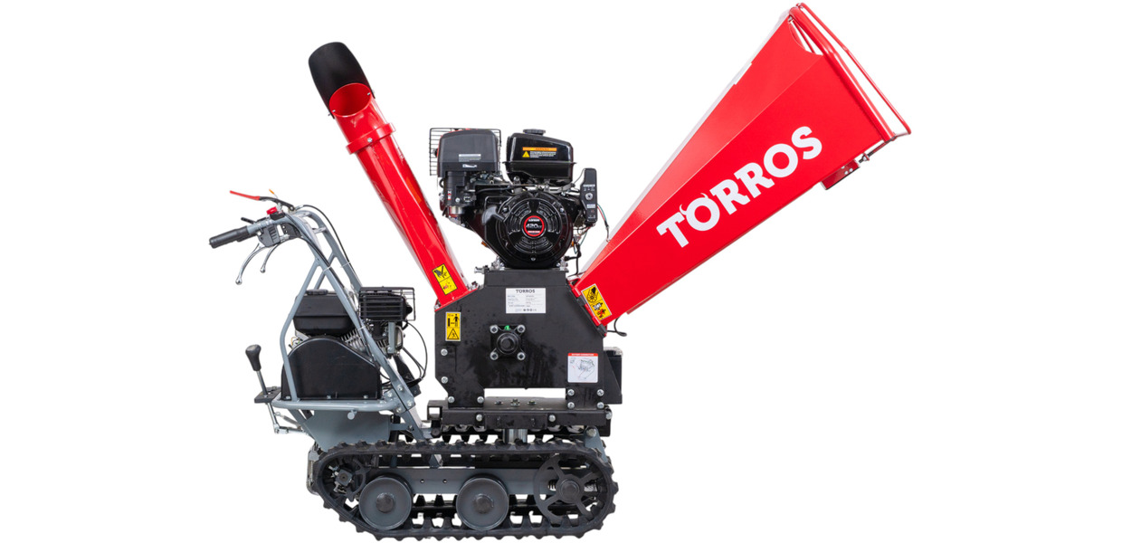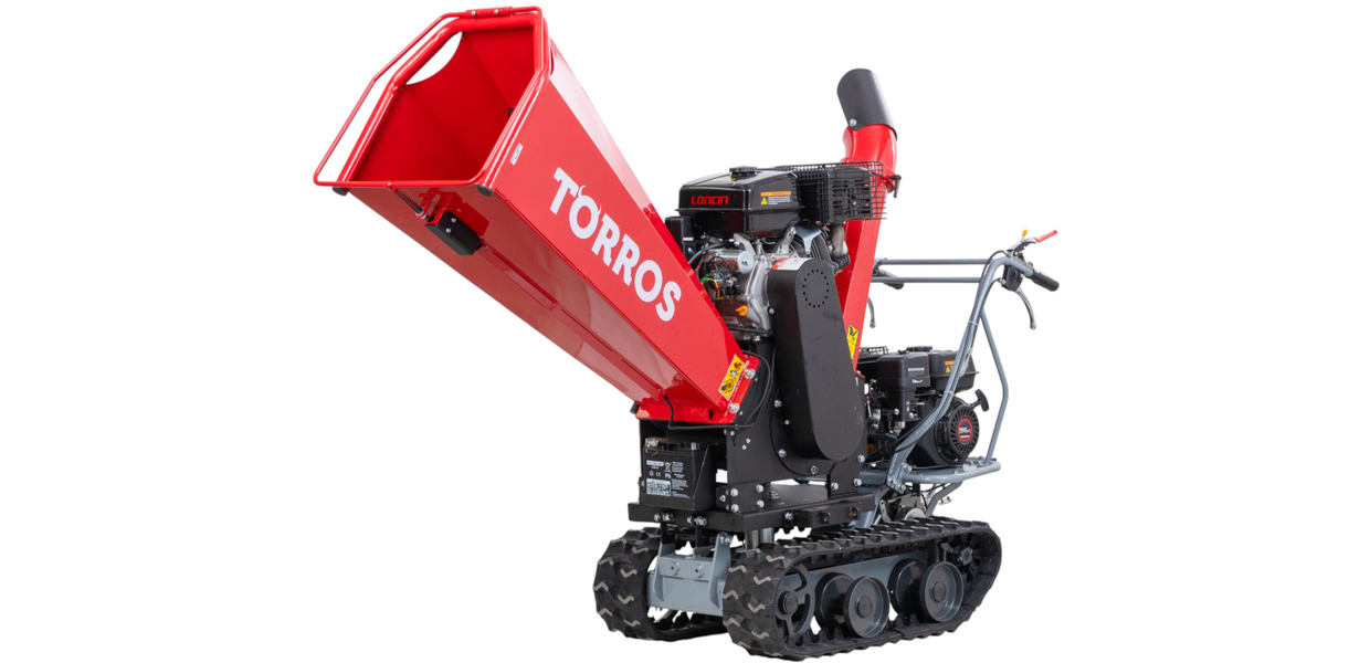 Broyeur de branches sur chenilles ø120mm 15CH 420cc essence démarrage électrique + brouette à moteur à chenilles plateau 300kg 6,5CH Torros
