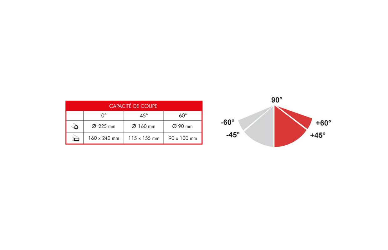- Coupe d'onglet possible grâce à l'orientation de l'arc de scie de 0° à 60° via une poignée puissante montée dans le socle
