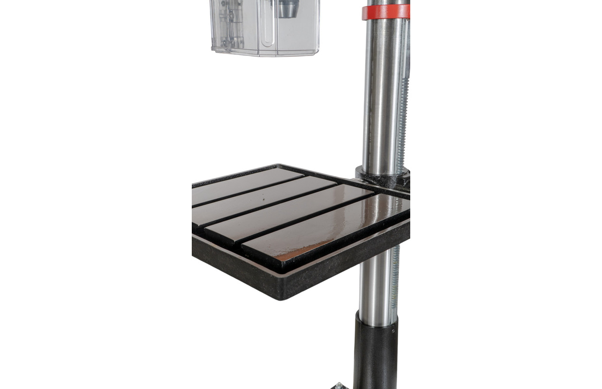 - Table de travail en fonte usinée avec précision, avec 3 rainures, équipée d'une arête de refroidissement, pivotant de -45° à +45° et tournant à 360° autour de la colonne, réglable en hauteur à l'aide d'une large crémaillière